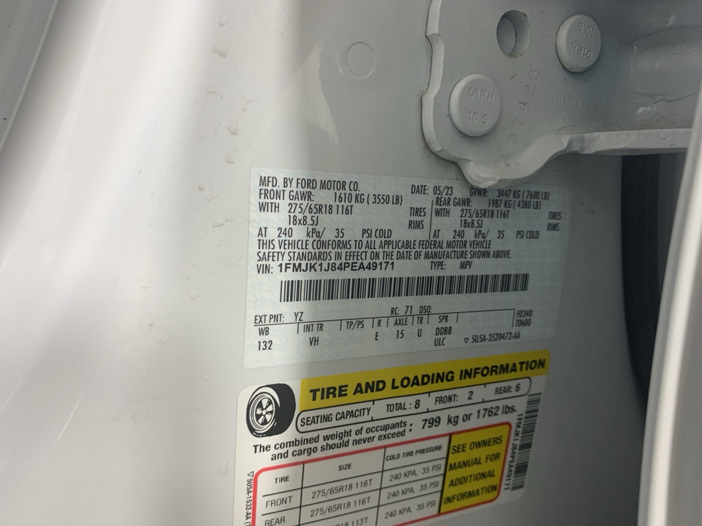 Equipment Group 202A High Package: 7. 550 lbs GVWR; AM/FM Stereo with MP3 Capable; Heated/ventilated Front Seats; 110V/150W AC Power Outlet; 10-Speed Automatic Transmission with SelectShift; ActiveX-Trimmed 1st and 2nd Row Seats; Power-Adjustable Pedals with Memory; Bright Chrome Plated Accent Platform Running Boards; 3.5L EcoBoost V6 Engine; Power Tilt/telescopic Steering Wheel with Memory; Ambient Lighting; Remote Start; Advanced Security Pack; Wireless Charging Pad; Power Liftgate; 2nd Row Power-Folding Captain's Chairs; Accent Color Painted Rear Bumper; Heated Steering Wheel; Power-Folding Sideview Mirrors with Autofold; 3rd Row Vinyl Power-Folding Head Restraints; 4-Door Intelligent Access (lock/unlock); SecuriCode Keyless Entry Keypad; 3.31 Axle Ratio. 2nd Row Power-Folding 40/20/40 ActiveX Bench Seat. ActiveX-Trimmed 1st and 2nd Row Seats. Black Roof-Rail Crossbars. **Equipment listed is based on original vehicle build and subject to change. Please confirm the accuracy of the included equipment by calling the dealer prior to purchase.**