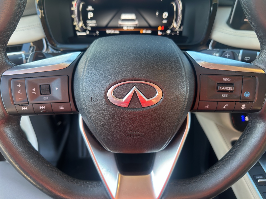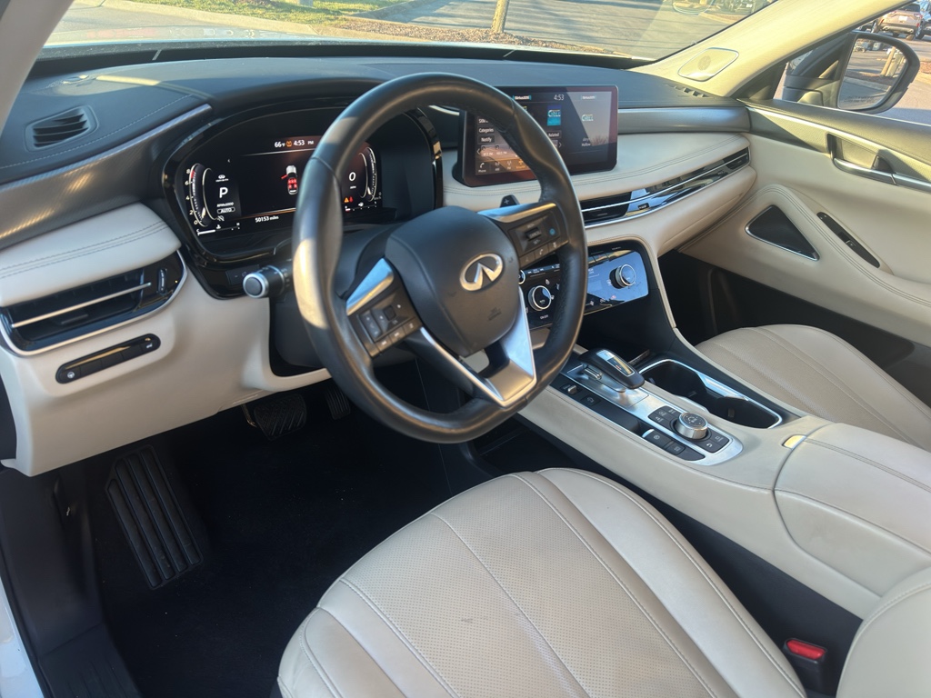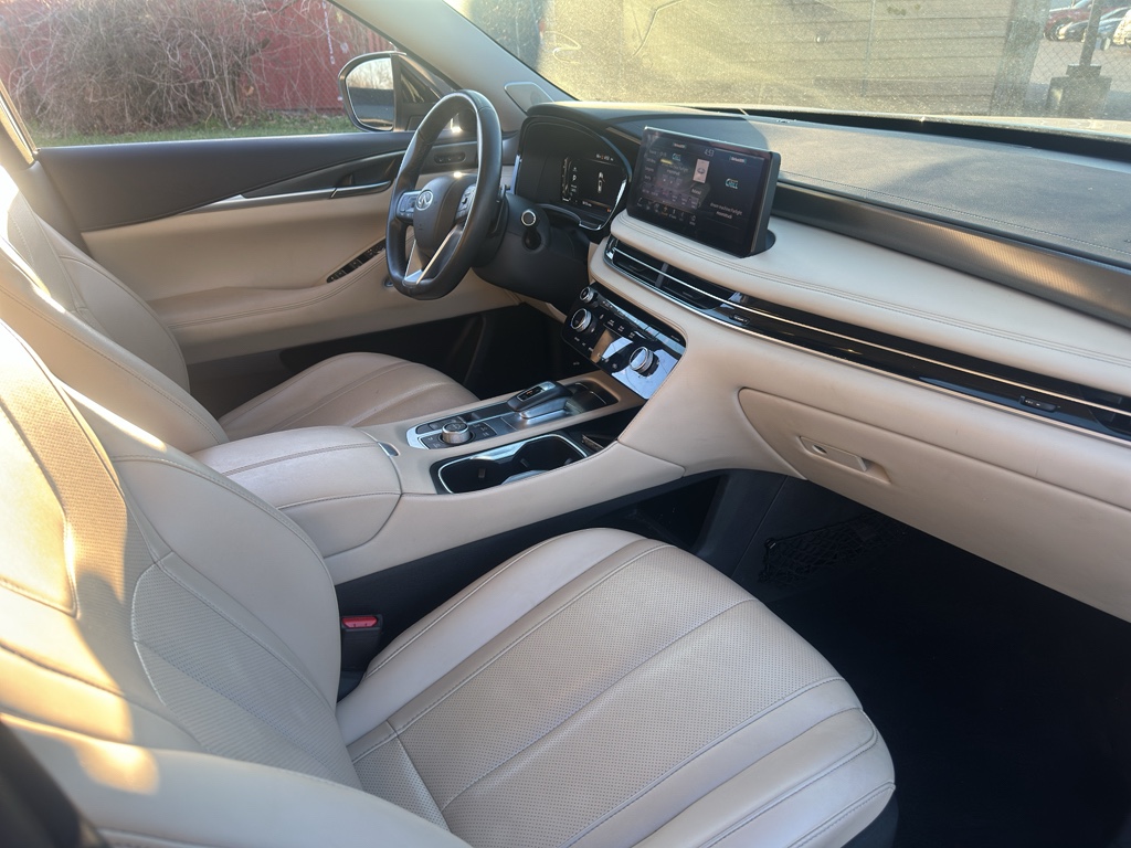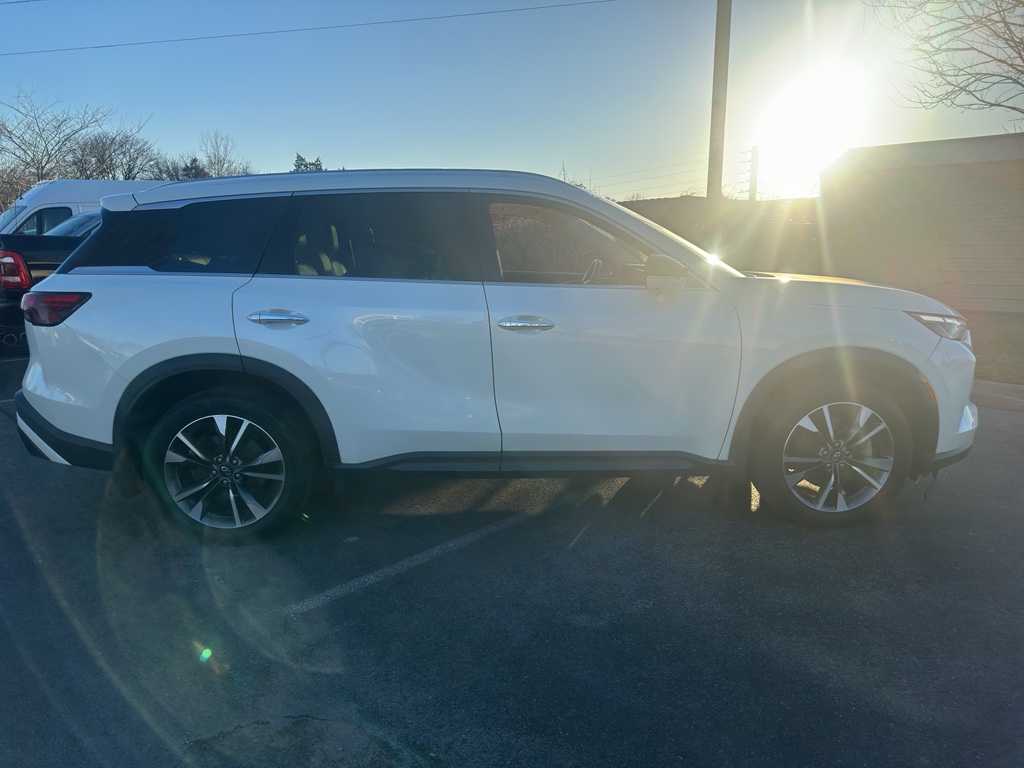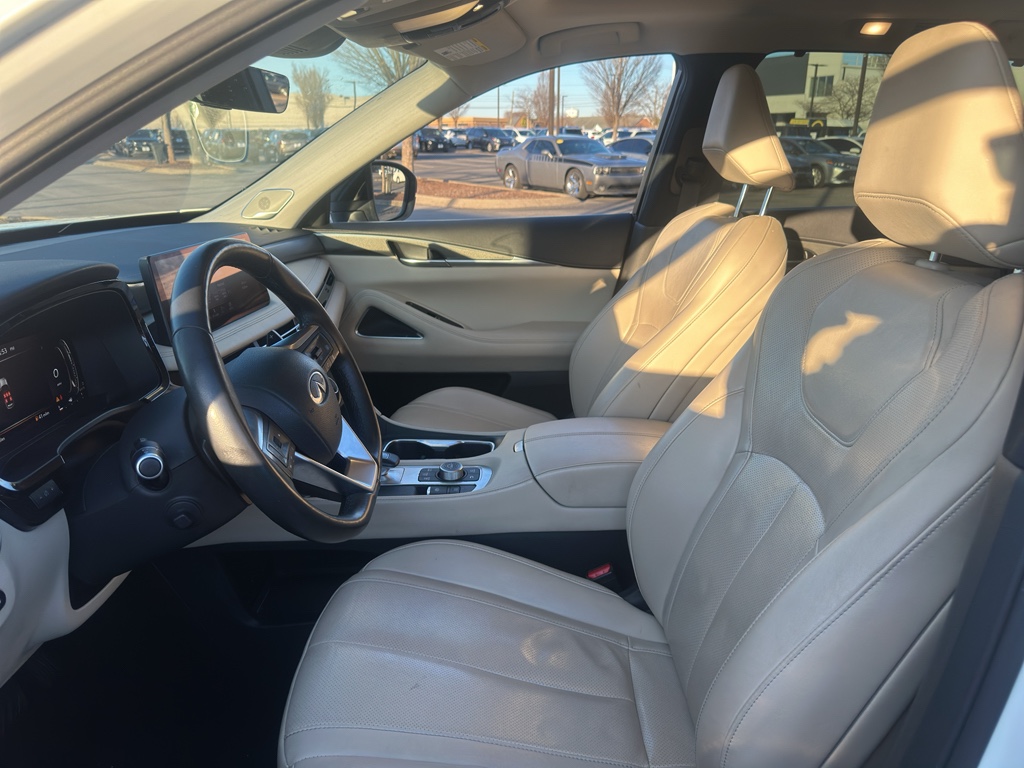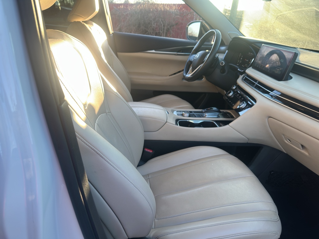 Enough room to carry all your cargo, passengers and equipment on a long road trip. Offering a ride height that is above most other vehicles, it has great visibility on the road. Conquer any rainy, snowy, or icy road conditions this winter with the all wheel drive system on this 2023 INFINITI QX60 . This vehicle offers Android Auto for seamless smartphone integration. Apple CarPlay: Seamless smartphone integration for this vehicle - stay connected and entertained on the go! This vehicle has an automatic transmission. The vehicle features a high end BOSE stereo system. See what's behind you with the back up camera on this vehicle. This vehicle is a certified CARFAX 1-owner. This INFINITI QX60 has a clean CARFAX vehicle history report. This unit has gone through a stringent manufacturer pre-owned certification process, including a meticulous mechanical and reconditioning processes. Take the stress out of car buying with this certified pre-owned. Maintaining a stable interior temperature in this unit is easy with the climate control system. Easily set your speed in this INFINITI QX60 with a state of the art cruise control system. Increase or decrease velocity with the touch of a button. This 1/2 ton suv has a V6, 3.5L high output engine. The vehicle's Forward Collision Warning feature alerts drivers to potential front-end collisions. Enjoy the tried and true gasoline engine in it. This 2023 INFINITI QX60 features a hands-free Bluetooth phone system. Keep your hands warm all winter with a heated steering wheel in this unit . The leather seats in the vehicle are a must for buyers looking for comfort, durability, and style. Help alleviate lower back pain with the driver seat lumbar support in the INFINITI QX60. You'll never again be lost in a crowded city or a country region with the navigation system on it. Enjoy the convenience of the power liftgate on this 1/2 ton suv. Never get into a cold vehicle again with the remote start feature on the vehicle. This model embodies class and sophistication with its refined white exterior. with XM/Sirus Satellite Radio you are no longer restricted by poor quality local radio stations while driving it. Anywhere on the planet, you will have hundreds of digital stations to choose from.